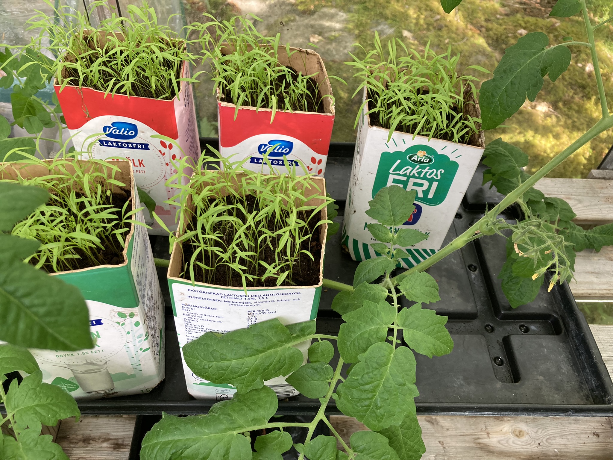 Min nya sådd av morötter i mjölkkartonger som ska ge morötter i höst står och mår bra i lilla växthuset.